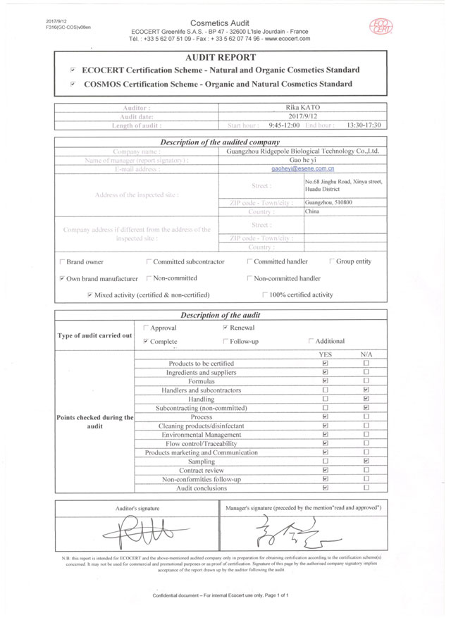 9月12日,ECOCERT有機(jī)認(rèn)證官RIKA KATO(加藤里香)女士、唐雪梅老師蒞臨棟方股份,對(duì)我司進(jìn)行“ECOCERT天然有機(jī)化妝品生產(chǎn)認(rèn)證”年度復(fù)審。