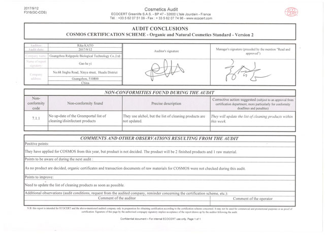 經(jīng)一系列嚴(yán)苛的文件資料審核、現(xiàn)場(chǎng)確認(rèn)等程序,棟方股份順利通過(guò)檢查組一致確認(rèn),繼續(xù)保持“歐盟ECOCERT天然有機(jī)化妝品生產(chǎn)認(rèn)證”榮譽(yù)資質(zhì)。