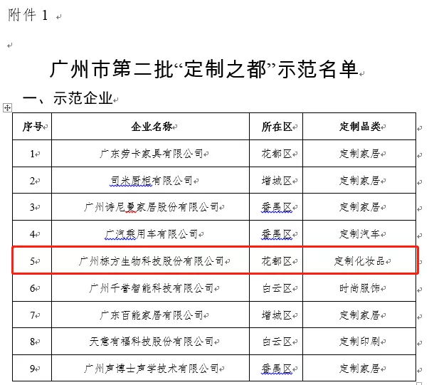 2021年10月20日,廣州市工業(yè)和信息化局官網(wǎng)公布了2021年廣州第二批“定制之都”示范單位入選名單,廣州棟方生物科技股份有限公司(簡稱:棟方股份)入選為9家“示范企業(yè)”之一,同時棟方股份成為唯一一家化妝品定制入選的企業(yè),這是對棟方股份深耕化妝品研發(fā)、樹立化妝品行業(yè)標(biāo)桿的認(rèn)可。